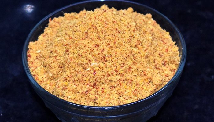 வெறும் வாணலியில் கடலைப்பருப்பு, உளுத்தம்பருப்பு, எள்ளையும் தனித்தனியாக வறுத்துக் கொள்ளவும். கடாயில் எண்ணெய் விட்டு காய்ந்த மிளகாயை வறுத்துக் கொள்ளவும். முதலில் கடலைப்பருப்பு, உளுத்தம்பருப்பை மிக்ஸியில் ரவை பதத்துக்கு அரைத்து, அதனுடன் வறுத்த எள், காய்ந்த மிளகாய், உப்பு, பெருங்காயத்தூள் சேர்த்து நன்கு அரைத்து எடுக்கவும்.